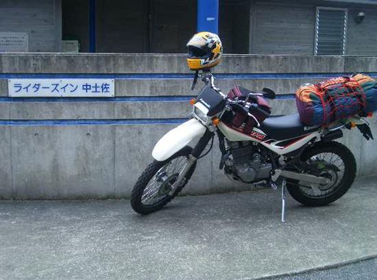 近くにライダースイン中土佐というライダーズハウスがあったので、そこに泊まることにした。 しかし、そこに行くまでには細くてクネクネした道が延々と続いたのだった・・・。 地図で見るのと実際に行くとでは大違いの道だった。 無事に着き、フロントに行くと、サッカークラブの合宿で来ていた一人の少年が笑顔で「バイク??」と、聞いてきた。 自分がうなずくと、少年は感嘆の声を上げてくれた。