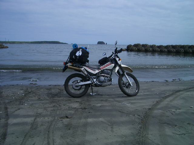 襟裳岬に向かう途中にマップルを見るとバイクで砂浜を走れる「渚のドライブウェイ」というところがあったので寄ることに。 その場所には着いたのだが、砂浜への入り口が見つからない。 1時間ぐらい探索しても見つからなかったので、あきらめて先へ進んだ。 が、そのときに偶然砂浜へ入りこめるところを発見したのだ!! すぐ隣が波打ち際で、こんなところをバイクで走っているのが新鮮でたまらない!! 面白すぎる!! 普段ならバイクを異常に大事にしている自分は「